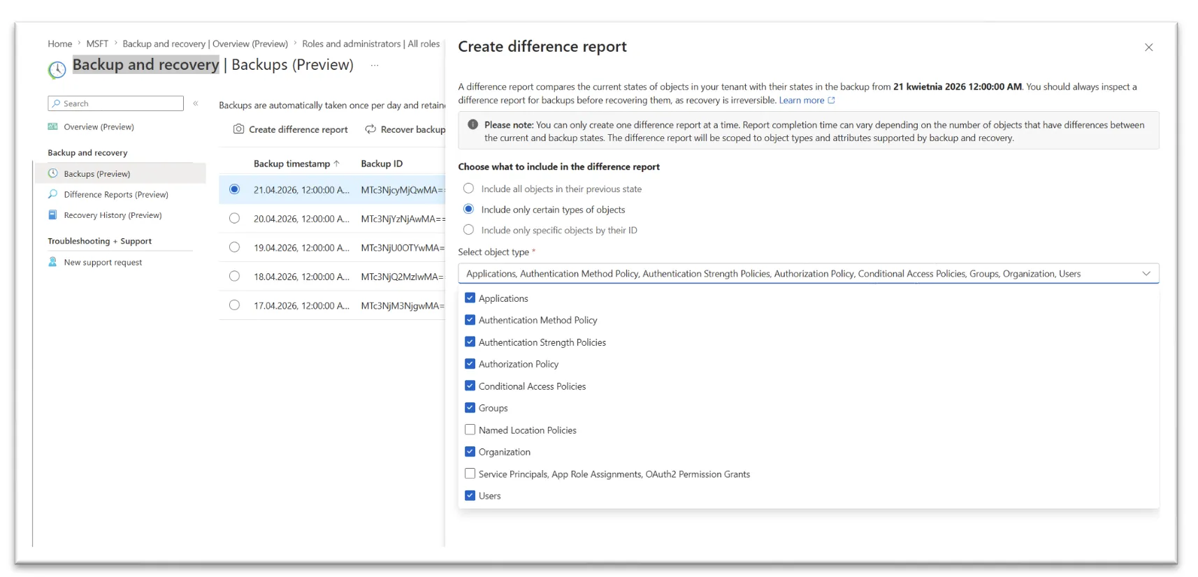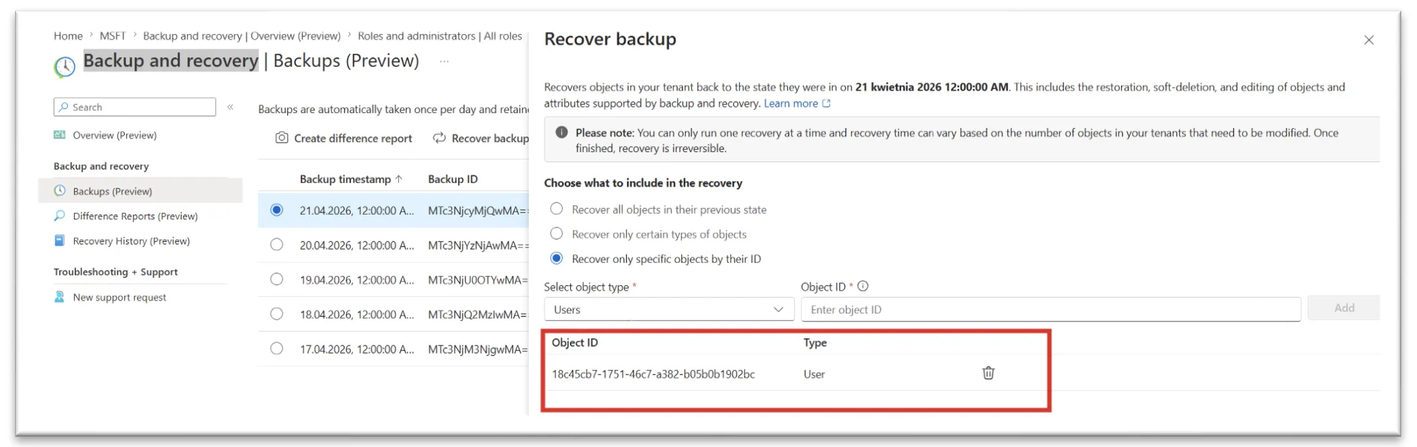 Z perspektywy administratora bardzo praktyczna jest możliwość odzyskiwania pojedynczych obiektów. Można najpierw utworzyć difference report, czyli porównanie backupu z aktualnym stanem tenanta, a następnie odzyskać tylko jeden wybrany obiekt z poziomu panelu zmian. Jest też druga ścieżka: odzyskiwanie bezpośrednio z backupu, z zawężeniem do określonych typów obiektów albo do konkretnych object ID. Microsoft pozwala wskazać do stu obiektów po ID w jednym zadaniu recovery. To oznacza, że funkcja nadaje się nie tylko do większych incydentów, ale też do odkręcania pojedynczych, kosztownych pomyłek.